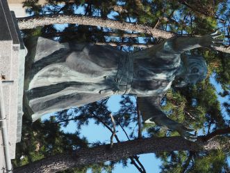 C'est dans cette petite ville paisible et rayonnante, au sud-ouest de la presqu’île du Kii, au bord du Pacifique, qu'est né Morihei Ueshiba, dont la statue de bronze trône, pour le moment, dans l'enceinte d'un… chantier (photo ci-dessous à droite). Aussi ai-je préféré me rendre, dès jeudi matin, au temple de Kozan-Ji, où le fondateur de l'aïkido a été inhumé il y a 50 ans, pour me recueillir sur sa tombe (photo ci-dessous à gauche) et lui rendre hommage.